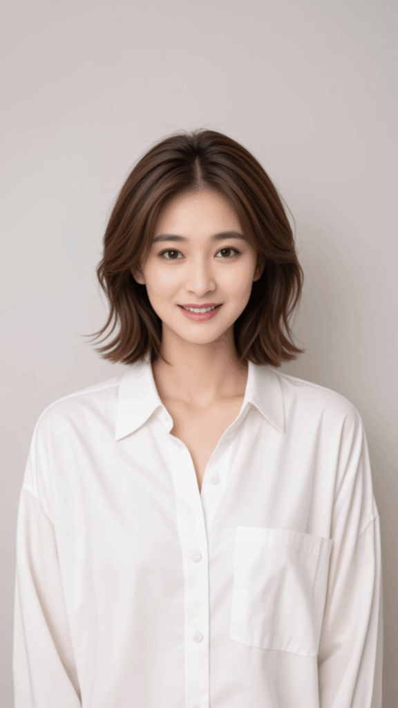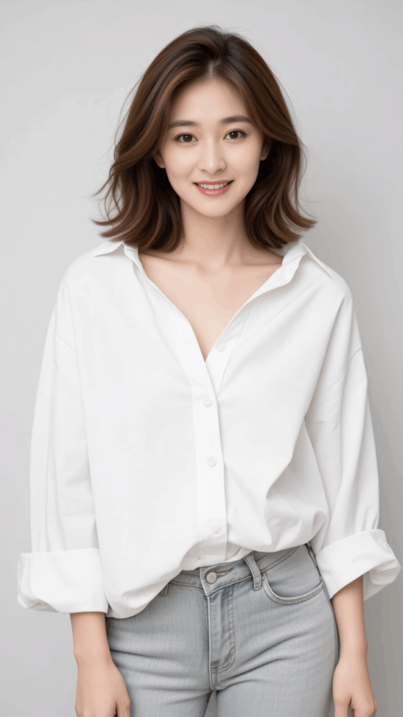 She is wearing an oversized, loose-fitting white shirt and light gray denim pants.