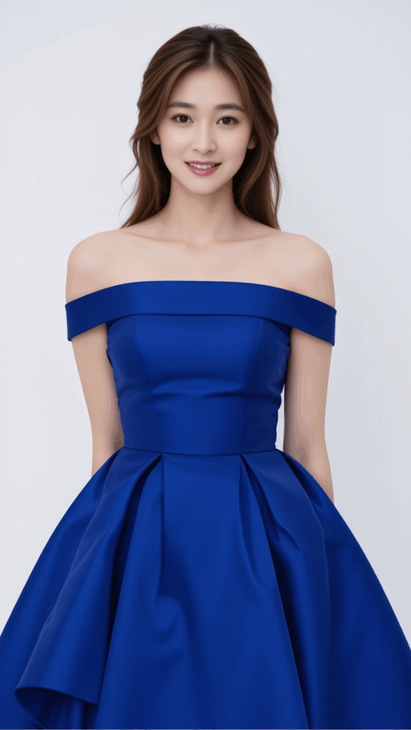 wears a blue dress luxury,A cropped dress,Off-the-shoulder,