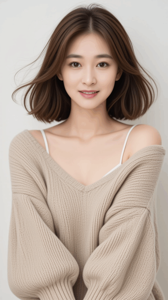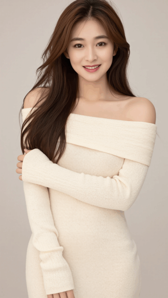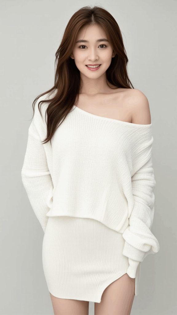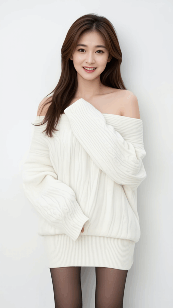A loose white wool sweater, off-the-shoulder top, a tight miniskirt,