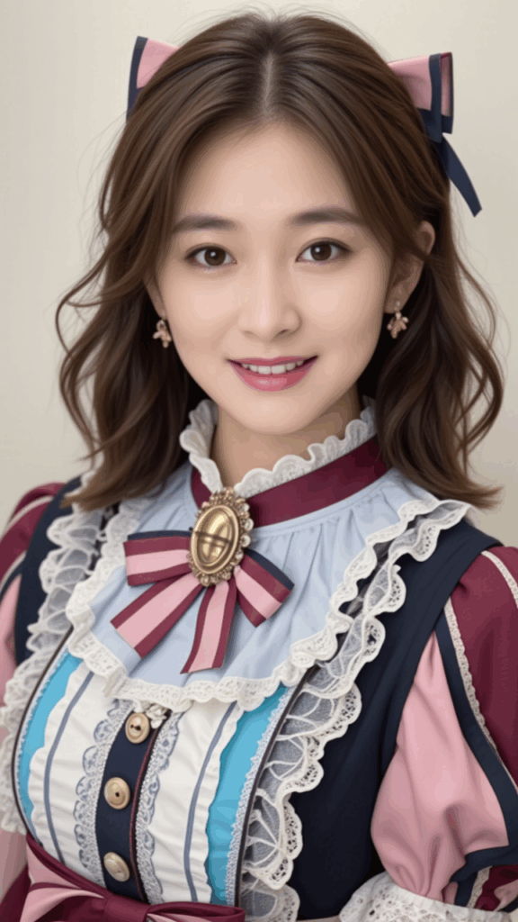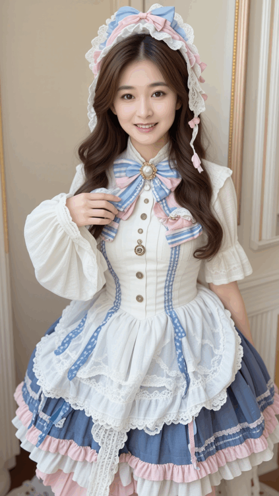 (wearing Lolita's baroque costume:1.3),(decorated with colorful lace:1.3),( white coloring :1.3),(buttons and brooches decorated on the bodice:1.3),