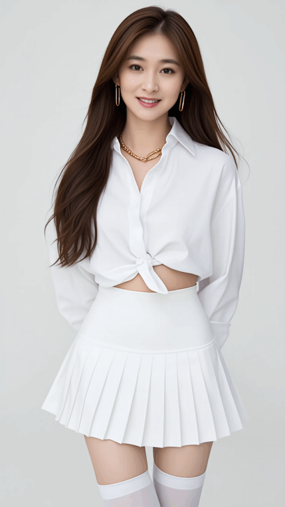 White blouse, white micro mini skirt, white leggings, stylish white blouse, fashionable platinum necklace, fashionable platinum earrings, (white ultra mini skirt: 1.4), knee-high socks,