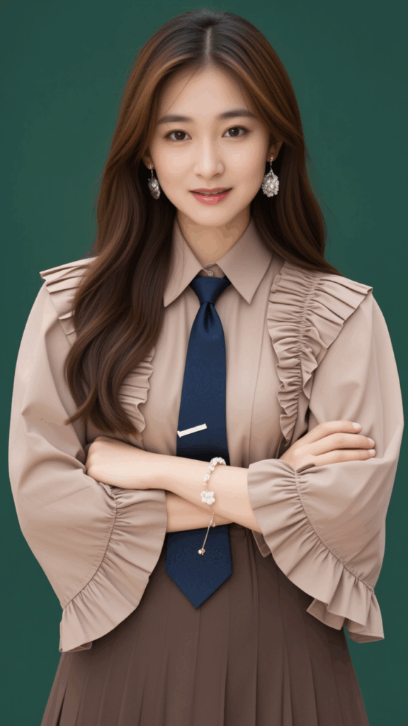Old dress, collared shirt, long sleeves, tie, capelet, ruffles, long dress, white diamond earrings, bracelet diameter, Deya necklace,