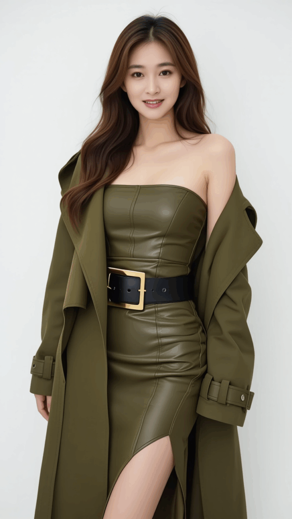 She wears a well-tailored olive-green trench coat and a form-fitting, off-the-shoulder leather dress of the same color, with smooth panels, intricate seams, and a deep slit down one side, which cinches in at the waist and accentuates her slim waist with a wide black patent leather belt with a square gold buckle.