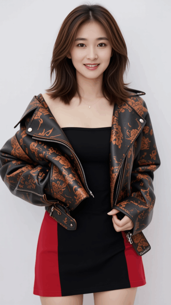 Wearing a gorgeous blouse leather dress, cropped dress, off-the-shoulder,