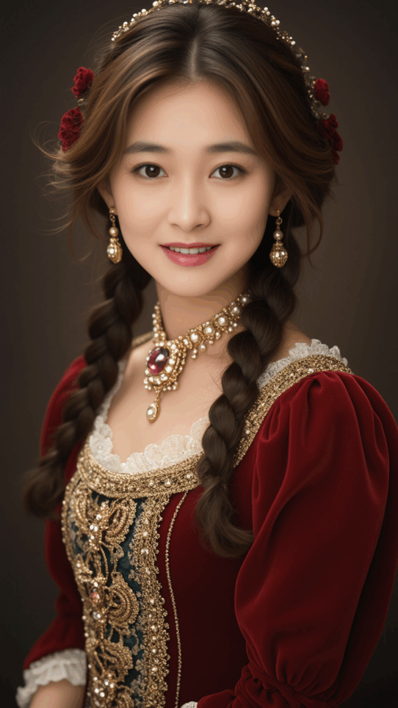 Very small earrings, wearing a Lolita baroque costume, decorated with colorful lace, buttons and brooches on the torso,