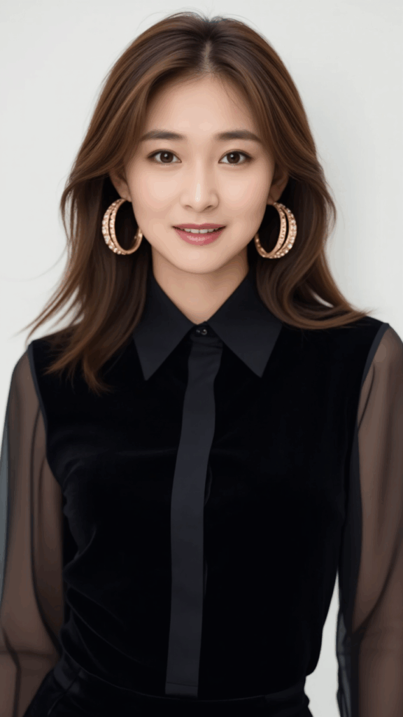 one beautiful woman in a black see-through shirt, large earrings,