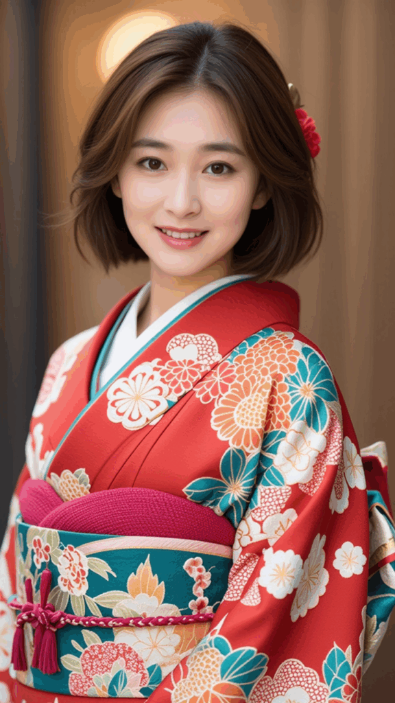 wearing a gorgeous kimono made of Yuzen fabric.