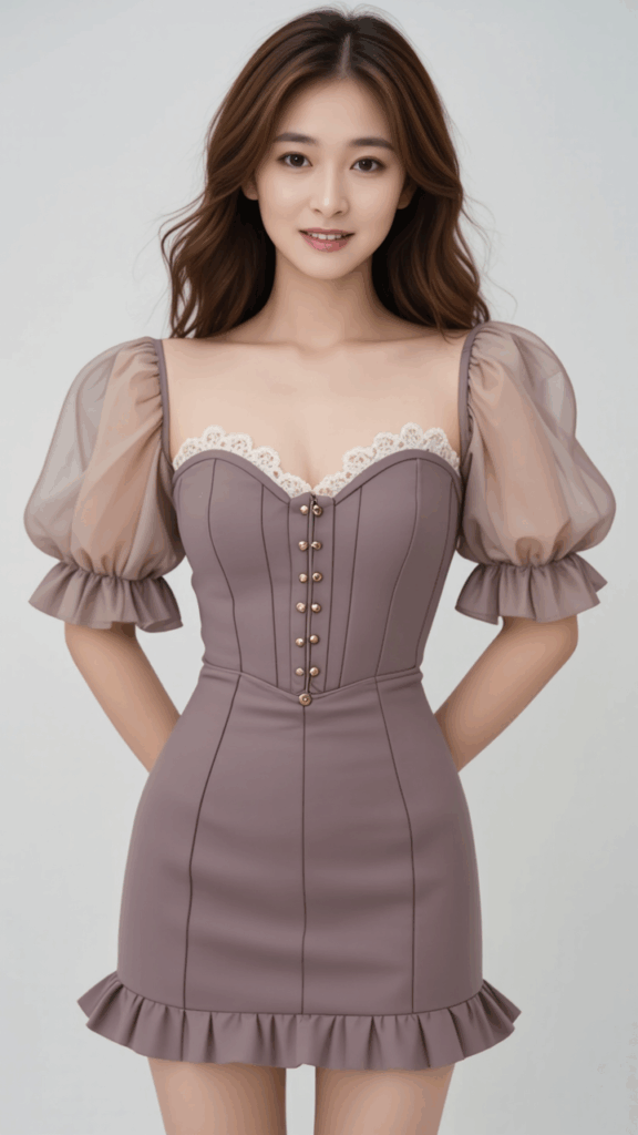 A stylish outfit featuring a taupe-colored mini dress with a corset-style bodice. The bodice is structured with vertical seams and metallic hook fastenings at the front, giving it a sleek, form-fitting silhouette. The neckline is strapless and slightly. giving it a sleek, form-fitting silhouette. The neckline is strapless and slightly. heart-shaped, decorated with delicate lace trim for a touch of femininity. The sleeves are detached and designed in a puffed style, made of sheer, soft beige fabric that gathers at the upper arm and flares out with a ruffled cuff, creating a romantic, vintage-inspired look. The skirt is tight and short, matching the corset fabric, highlighting an elegant and modern appeal.