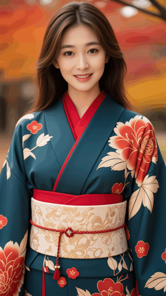 A traditional Japanese kimono featuring an elegant floral pattern. The base fabric is a deep teal blue, richly decorated with large chrysanthemum and plum blossom motifs in shades of red, ivory, and gold, giving a sense of seasonal beauty. The kimono has wide sleeves with red lining peeking through the inner hem, adding depth and sophistication. A bright red obiage accentuates the waist, tied over a wide ivory-white obi with subtle woven patterns, secured with a delicate obijime cord that includes a small ornamental clasp at the front. The overall look conveys grace, tradition, and refinement, perfectly suited for an autumn setting.