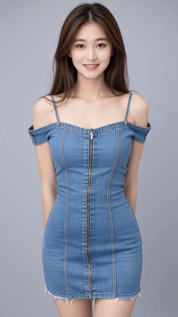 a tight-fitting, off-shoulder denim mini dress, made of medium-wash blue denim fabric, button-down closure running vertically along the front, structured corset-style bust with defined stitching and seams, slightly faded denim texture with visible vertical seams, short hemline ending high on the thighs, raw but neatly finished hem, slim fit silhouette emphasizing curves, reinforced topstitching on the bust and waist for contouring, off-shoulder straps loosely slipping down the arms
