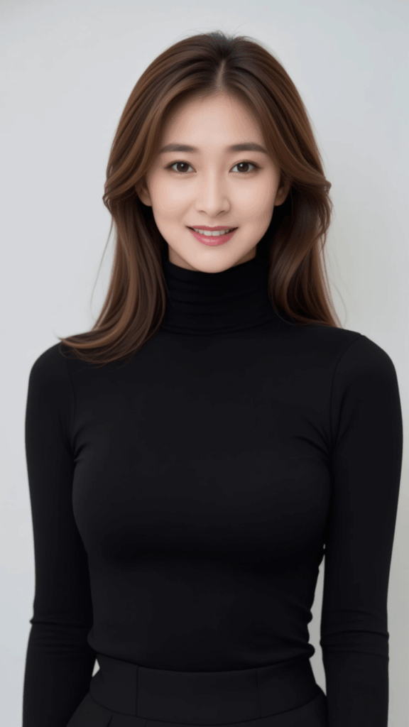 Simple black turtleneck top, slim-fitting silhouette that hugs the body, long sleeves extending to the wrists, high-neck turtleneck design, fabric is thin, stretchy, and soft in texture, matte surface with little to no shine, plain solid color with no decorations or patterns, elegant and understated atmosphere emphasized