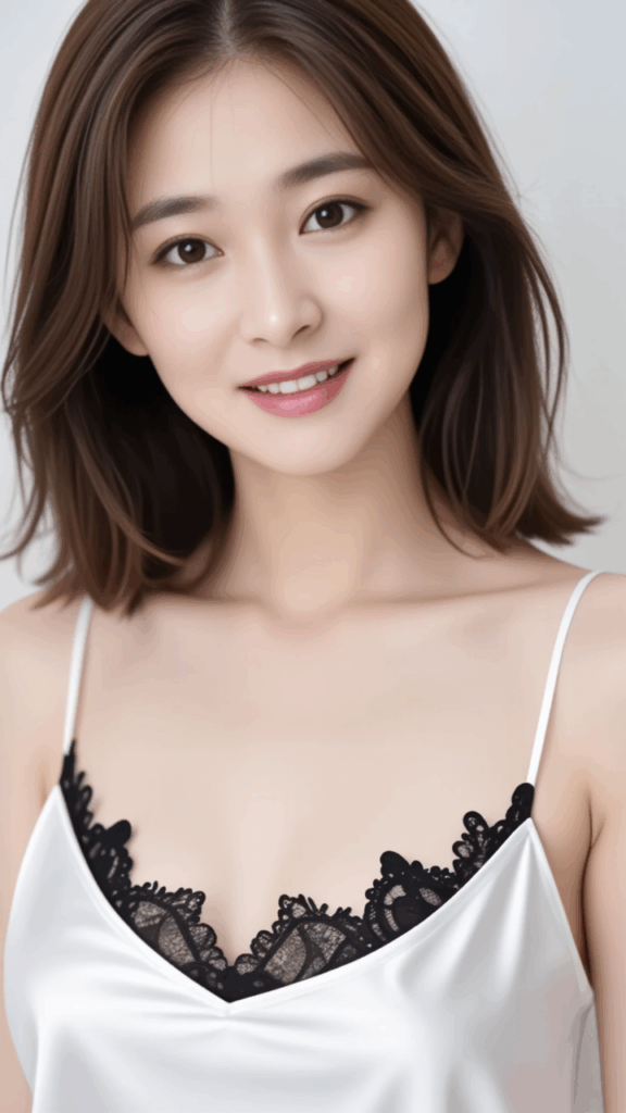 White camisole top, made of shiny, satin-like material with a smooth texture. It features delicate black lace detailing at the chest. Its thin straps create a simple, feminine look and a silhouette that naturally follows the body line.