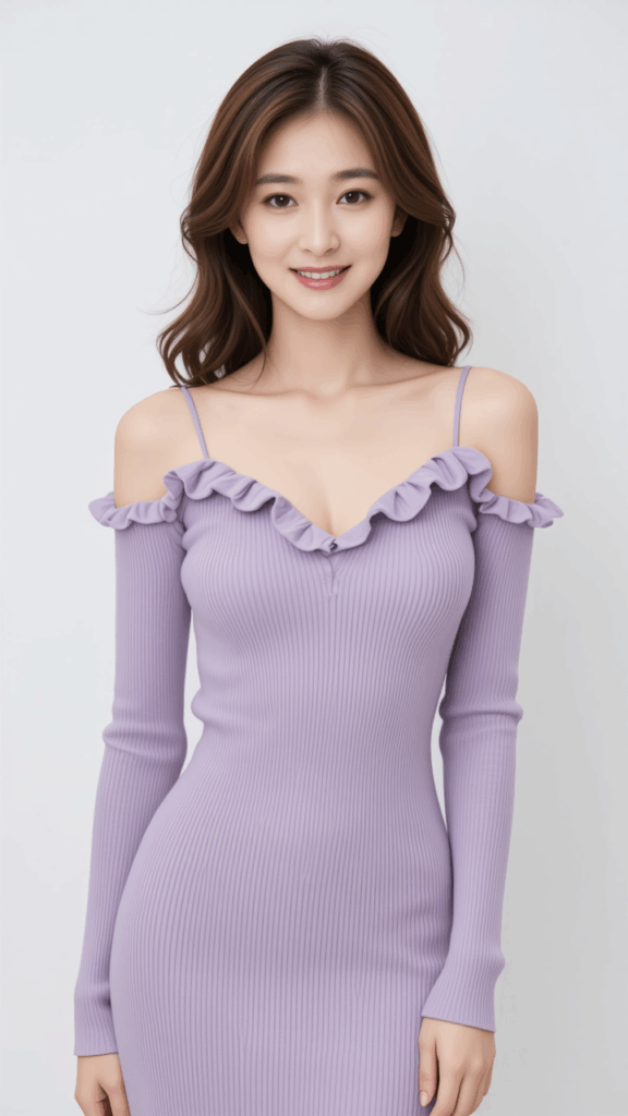 Off-the-shoulder ribbed knit dress in pale lavender. The entire dress is made with thin vertical ribbing for a soft, fitted silhouette. The deep V-neck is delicately designed with ruffles edging. The thin shoulder straps and off-the-shoulder design create an elegant silhouette that shows off the shoulders. The long sleeves fit snugly down to the wrists. The material is a soft, stretchy knit with a smooth texture. A simple and elegant dress that accentuates your feminine lines.